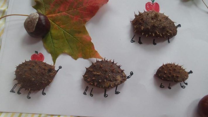 Forma przygotowania: podczas jesiennego spaceru, zbieramy „kolczaste” łupinki po kasztanach, by w domu nakleić je na białe lub kolorowe kartki papieru. Następnie dorysowujemy im brakujące elementy: w przypadku jeżyków – buzie i nóżki, w przypadku grzybków – trzonki, a w przypadku motylków – główki, czułki i tułów. Efekty są naprawdę niesamowite!