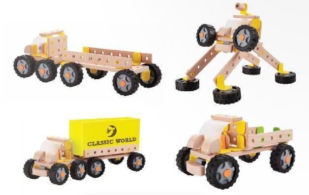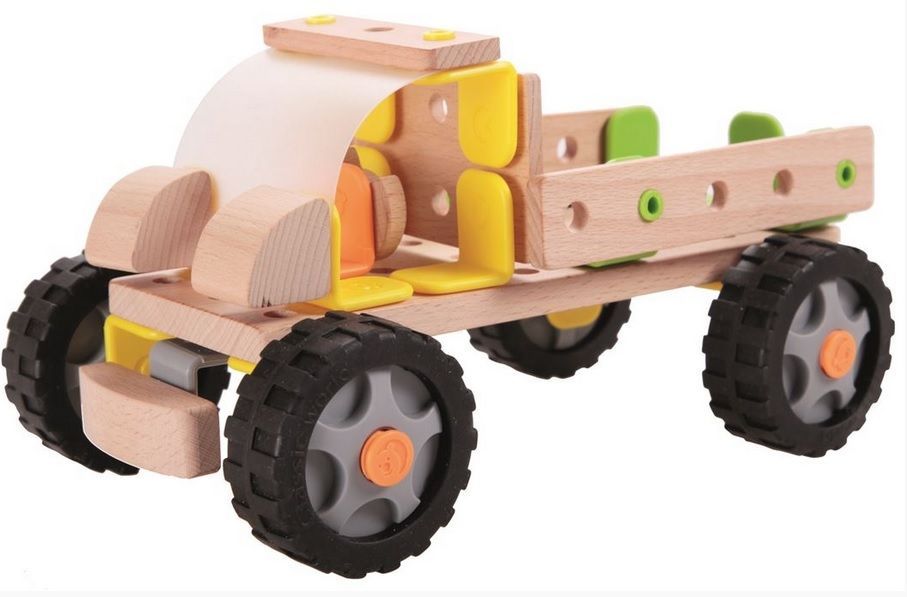 Klocki wykonane są z drewna, metalu i tworzywa. Ich montaż jest bardzo łatwy. Zabawa w konstruktora da dziecku mnóstwo radości oraz satysfakcji. Całość zapakowano w estetyczne opakowanie – zabawka doskonale nadaje się na prezent.