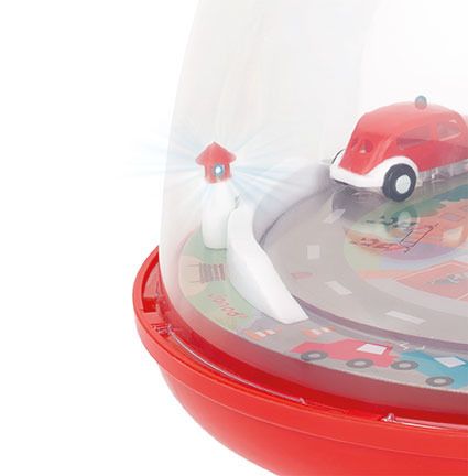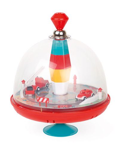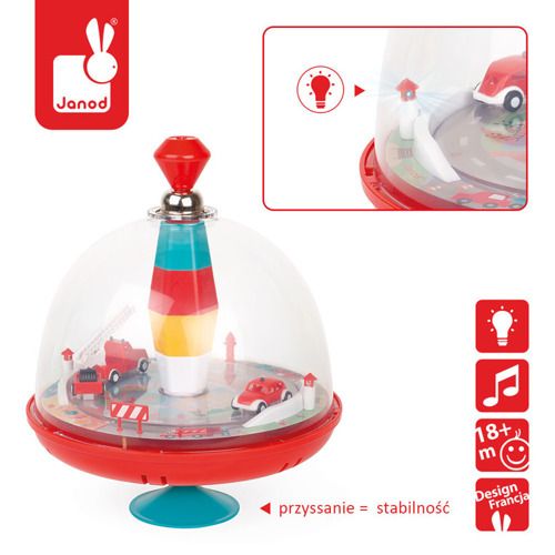 Bączek grający melodyjki ze strażą pożarną w środku. Po wprawieniu w ruch wiruje i wydaje dźwięki syren strażackich z różnych zakątków świata! Wtedy znajdujące się w środku samochodziki ruszają na pomoc! Wnętrze bączka ozdobione jest hydrantami i święcącymi latarniami.