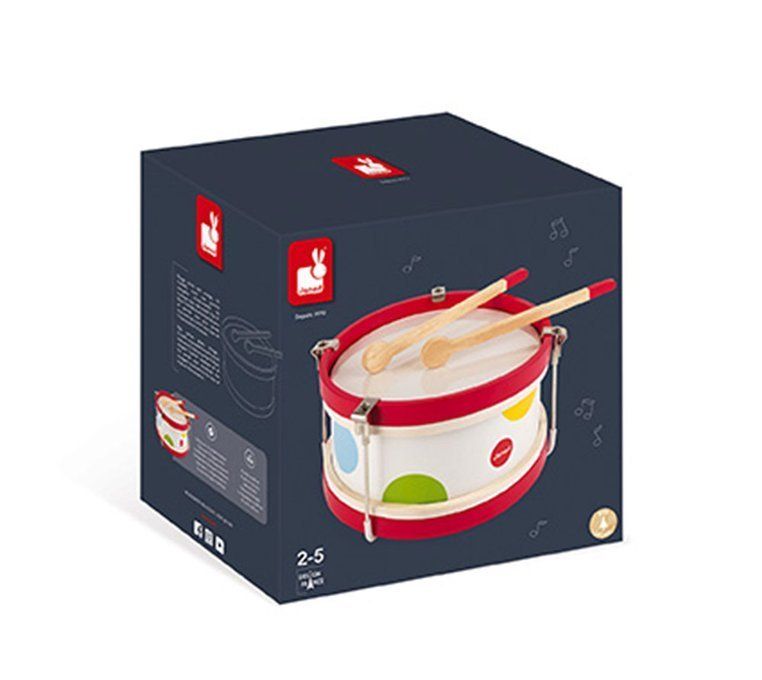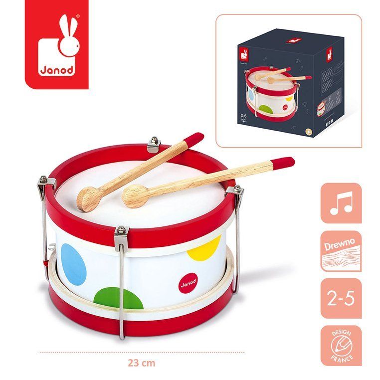 Drewniany bębenek Confetti francuskiej marki Janod idealnie sprawdzi się jako pierwsza zabawka muzyczna Twojego dziecka, która pomoże mu odkryć świat muzyki i dźwięków. Bębenek pomoże w rozwoju koordynacji ruchowej, uwrażliwi dziecko na dźwięki oraz rozbudzi w nim poczucie rytmu. Idealny na prezent dla dwulatka. Linia Confetti francuskiej marki Janod to pierwsze zabawki muzyczne Twojego dziecka. Uczą rozróżniania dźwięków, poczucia rytmu oraz wprowadzają w cudowny świat muzyki. Gra na nich rozbudza kreatywność, poprawia pamięć, uczy cierpliwości i wytrwałości, pomaga wyrażać emocje oraz daje wiarę w siebie. To połączenie zabawy z nauką zapewnia wszechstronny rozwój dziecka już od najmłodszych lat. W kolekcji znajdują się zabawki muzyczne przeznaczone dla dzieci od 12 miesiąca życia do nawet 8 lat! Seria Confetti dostosowana jest do dziecięcych możliwości, a jej unikalny design, piękne wykonanie i żywe kolory zachęcają dziecko do zabawy. Janod od 1970 roku niezmiennie projektuje zabawki, które są synonimem innowacyjności, francuskiego designu i najwyższej jakości. Unikalne zabawki Janod tworzone są z drewna i innych doskonałych materiałów, a przede wszystkim z dziecięcych marzeń! Janod – JUST PLAY