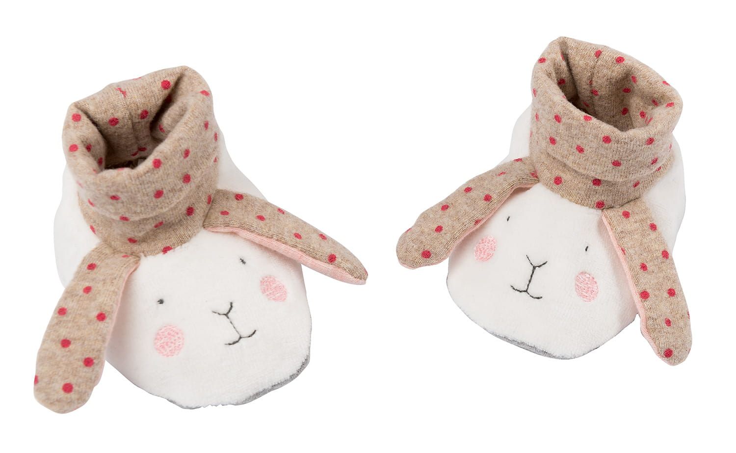 Śliczne, niemowlęce buciki Króliczki z kolekcji Les Petits Dodos od Moulin Roty. Buciki mają zabawne królicze uszy oraz wyszyte oczy i nos.