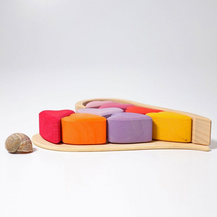 Zestaw składa się z 8 kolorowych klocków i ramki. Elementy zostały wykonane z drewna lipowego wykończonego nietoksycznymi bejcami na bazie wody. Klocki są przyjemne w dotyku. Można je układać w dowolny sposób. Zabawa ślicznymi, kolorowymi serduszkami z pewnością spodoba się każdemu małemu miłośnikowi drewnianych klocków!