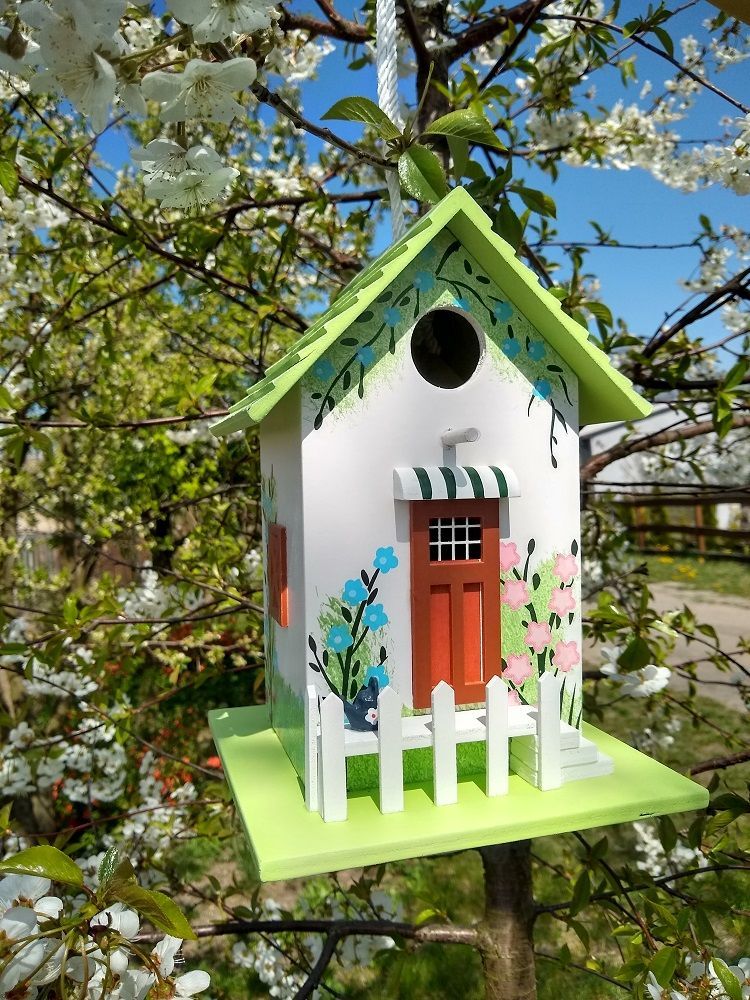 Domek dla ptaków – ozdobna budka lęgowa z zielonym dachem Sfd będzie stanowiła śliczną dekorację każdego ogródka. Ucieszy ona oczy zarówno dzieci, jak i dorosłych. Budka jest pięknie i starannie wykończona – na fasadzie znajdują się pastelowe kwiatuszki, do podstawy przymocowano płotek, na którym stoi konewka. Pod otworem wlotowym znajduje się kołeczek dla ptaków. Z tyłu umieszczono drzwiczki, które można otworzyć, aby wygodnie wsypać do środka pożywienie.