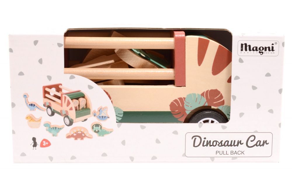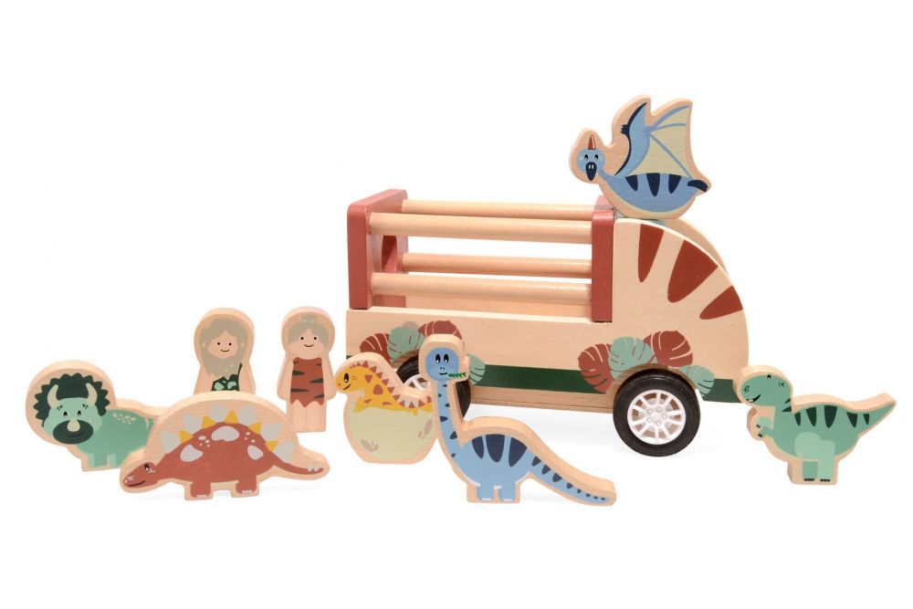 Drewniana ciężarówka Dino Magni to idealna zabawka dla młodszych dzieci. Dzięki temu zestawowi maluch może zobaczyć jak wyglądały różne gatunki dinozaurów oraz doskonale się przy tym bawić. Zestaw zawiera dwie figurki w kształcie ludzi, 6 figurek w kształcie dinozaurów i oczywiście pojazd, w którym można je przewozić.