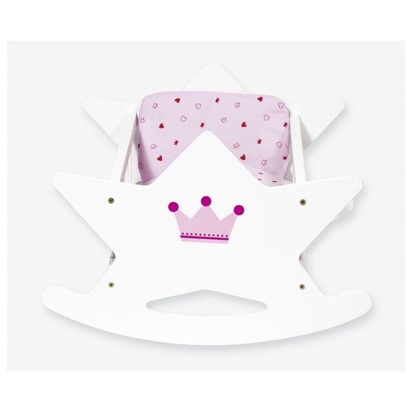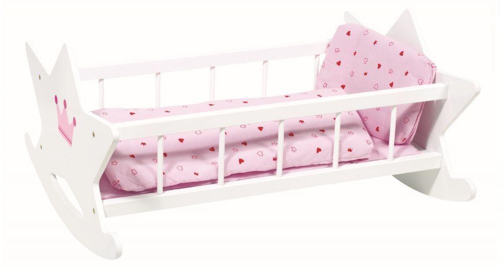 Prezent w postaci eleganckiej kołyski ucieszy każdego miłośnika zabaw lalkami! Kołyska została wykonana z drewna i polakierowana, dzięki czemu pięknie się prezentuje. Jej bok zdobi rysunek królewskiej korony. W zestawie znajduje się również komplet pościeli, więc smyk może natychmiast rozpocząć zabawę.