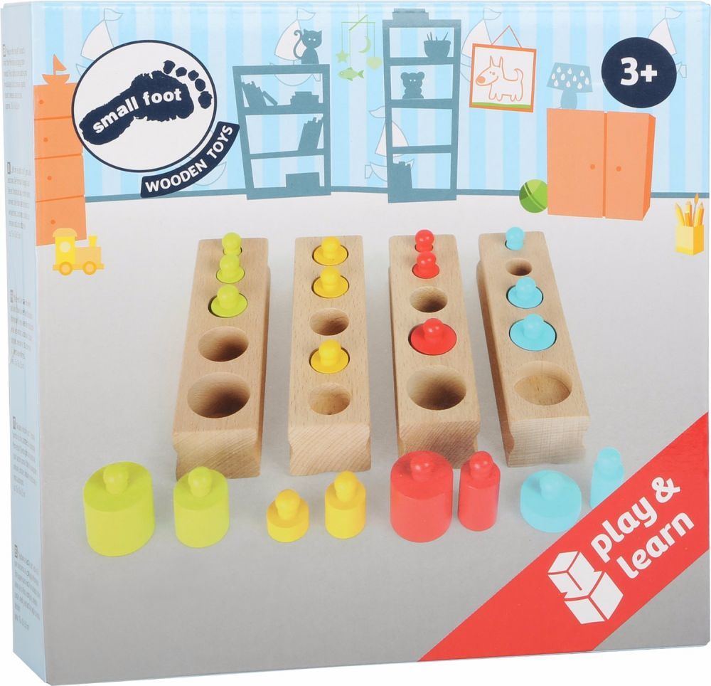 Zestaw składa się z czterech podstawek z otworami, w których umieszczono po 5 sztuk kolorowych odważników – czerwone, zielone, niebieskie i żółte. Każdy komplet różni się od siebie nie tylko kolorem, ale także innym zestawem cech. Zadaniem dziecka jest zauważyć, czym różnią się poszczególne elementy, a co jest w nich takie same. Przykładowo żółte odważniki mają jednakowe średnice, ale inną wysokość.