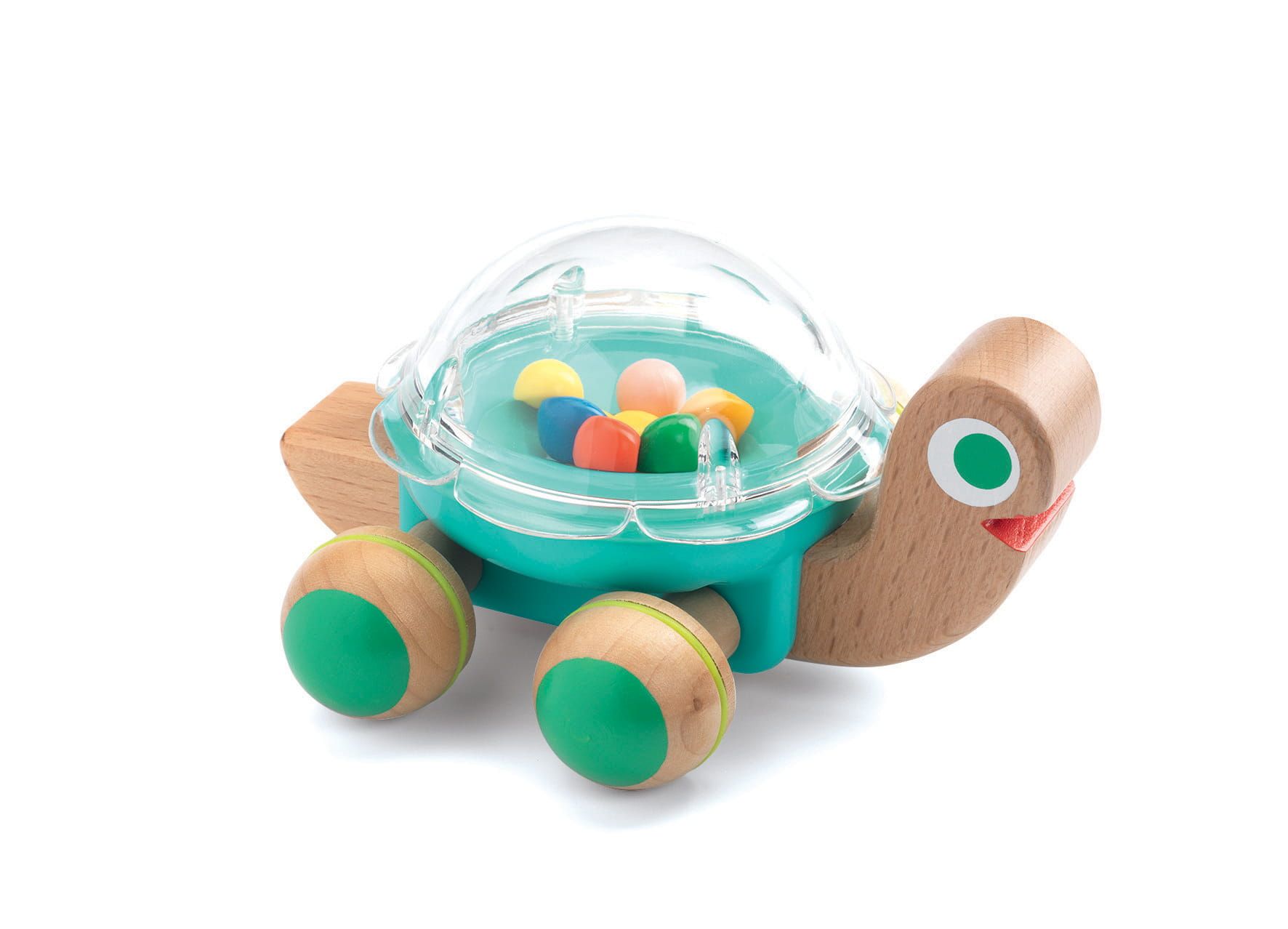 Lola na kółkach zauroczy każdego małego wędrowca! Zabawka składa się drewnianej podstawki w kształcie żółwia oraz przezroczystej skorupy wypełnionej kolorowymi kulkami. Podczas jazdy żółw wydaje grzechoczące dźwięki, które z pewnością zaintrygują smyka.