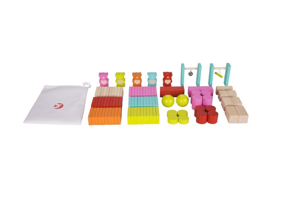Klocki domino w kształcie misia? Czemu nie! Wraz z zestawem 105 drewnianych elementów, Twoje dziecko będzie mogło tworzyć nieograniczoną liczbę wyjątkowych układów i cieszyć się z efektu przewracanych klocków domino. W skład kompletu wchodzą klocki w kształcie: misiów, prostokątów, kul, walca, kostki, prostopadłościanów, bramki z dzwoneczkiem i poprzeczką. Wszystkie elementy po skończonej zabawie można przechowywać w materiałowym woreczku, dołączonym do zestawu.