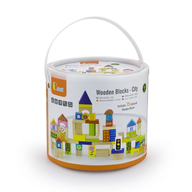 Zabawa klockami nigdy się nie nudzi! Drewniane klocki firmy Viga podbijają serca malców pięknymi kolorami oraz starannym wykonaniem. Zestaw Miasto zawiera 75 elementów ozdobionych obrazkami związanymi z motywem miasta. Klocki są zapakowane w plastikowe wiaderko z wygodną, ułatwiającą przenoszenie rączką.