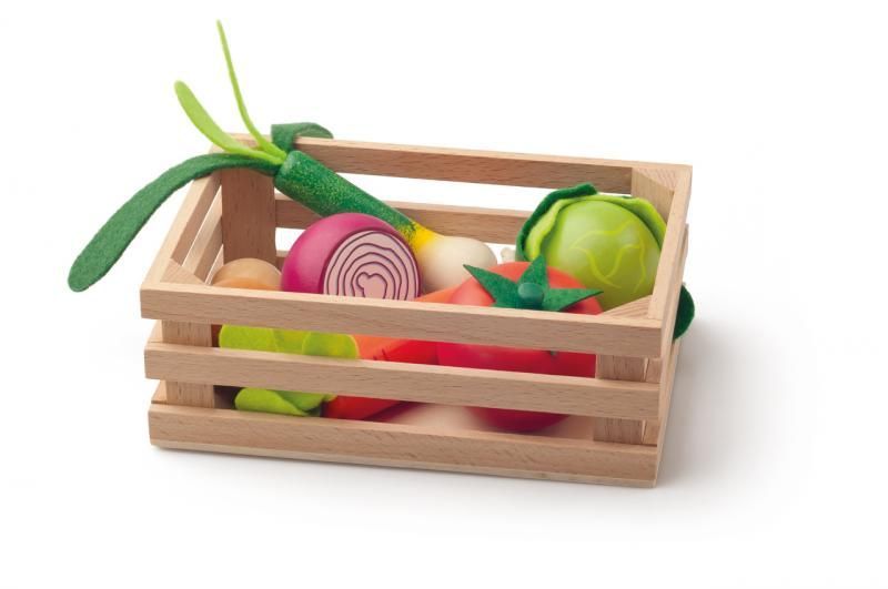 Warzywa i skrzynka do ich przechowywania wykonane są z drewna. Listki filcowe dekorują niektóre warzywa nadając im realizmu. Dzięki temu zestawowi, maluch przyswoić nazwy różnych warzyw oraz wdrożyć się w zasady zdrowego odżywiania.