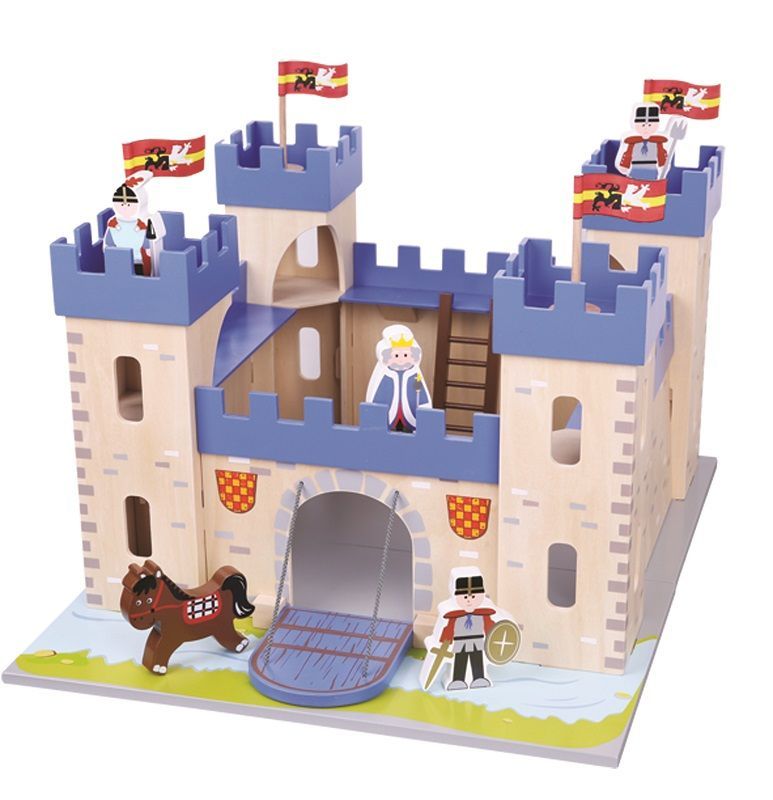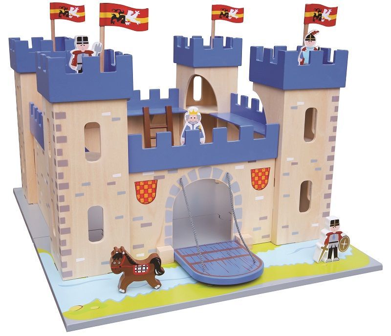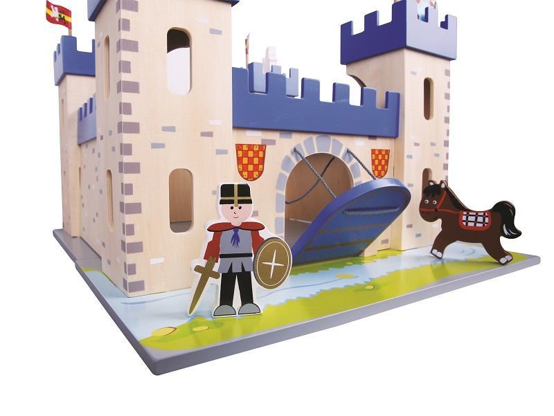 Zamek posiada również zwodzony most, który można podnieść dzięki zamontowanemu sznureczkowi – wystarczy go pociągnąć, aby podnieść lub opuścić most. Wszystkie elementy zamku zrobione są z drewna najlepszej jakości. Zamek jest bardzo ładnie i starannie wykonany, dzięki czemu Twoje dziecko z chęcią będzie chciało się nim bawić.