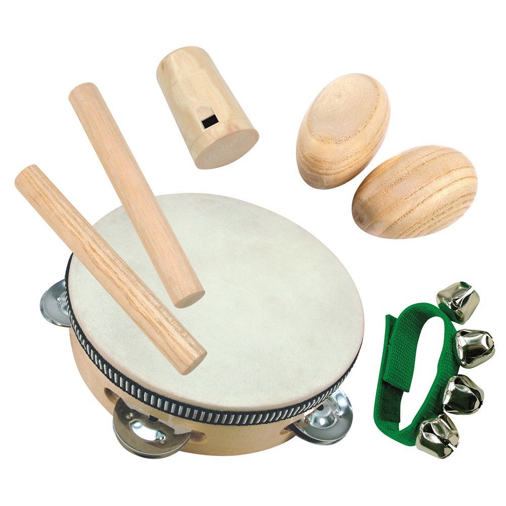 W jego skład wchodzi aż 8 instrumentów: tamburyn z 4 parami talerzyków z membraną do uderzania, 2 janczary – każdy z nich ma 4 dzwonki, umieszczone na pasku zapinanym na rzep, 2 jajka działające na zasadzie marakasów, 2 pałeczki perkusyjne do wybijania rytmu oraz gwizdek w postaci dużego walca. Wszystkie instrumenty mają niewielkie wymiary, dzięki czemu dziecko będzie mogło na nich swobodnie grać i trzymać je w rączkach. Wybijanie i utrzymywanie rytmu to znakomity sposób, aby urozmaicić zabawę dziecka i przy okazji wspomóc jego prawidłowy rozwój.