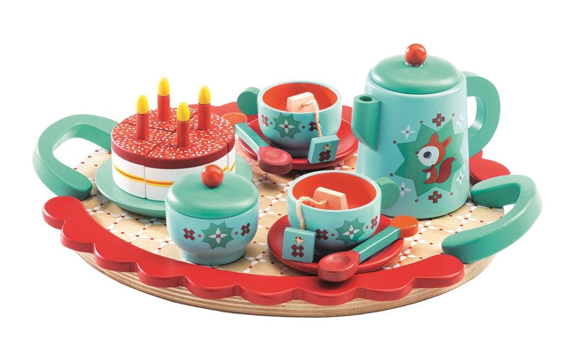 Komplet Przyjęcie urodzinowe to świetny pomysł na prezent dla dziecka z bogatą wyobraźnią. W opakowaniu brzdąc znajdzie dużą tacę z uchwytami, dzbanek, dwie filiżanki ze spodeczkami, dwie herbaty, dwie łyżeczki, cukierniczkę oraz tort ze świeczkami podzielony na cztery części. Wszystkie elementy zostały wykonane z drewna, więc całość na pewno zda egzamin!