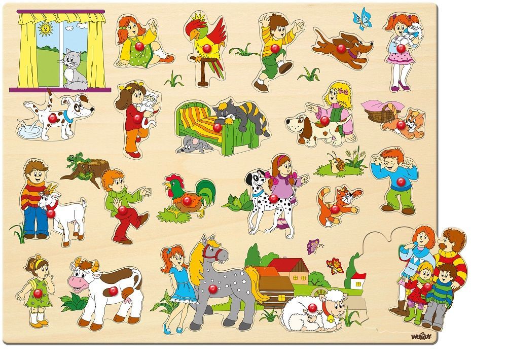 Tematem układanki są zwierzaki i ich właściciele – dziecko znajdzie tutaj m.in. psy, koty, papugę oraz zwierzątka gospodarskie takie jak: koza, krowa, owieczka. Niektóre elementy są ułożone i wykonane w taki sposób, że wskazują na interakcję pomiędzy zwierzakiem, a właścicielem lub pomiędzy zwierzątkami, co sprzyja wymyślaniu przez dziecko historyjek – to z kolei pozytywnie wpływa na rozwój wyobraźni oraz gwarantuje świetną zabawę!
