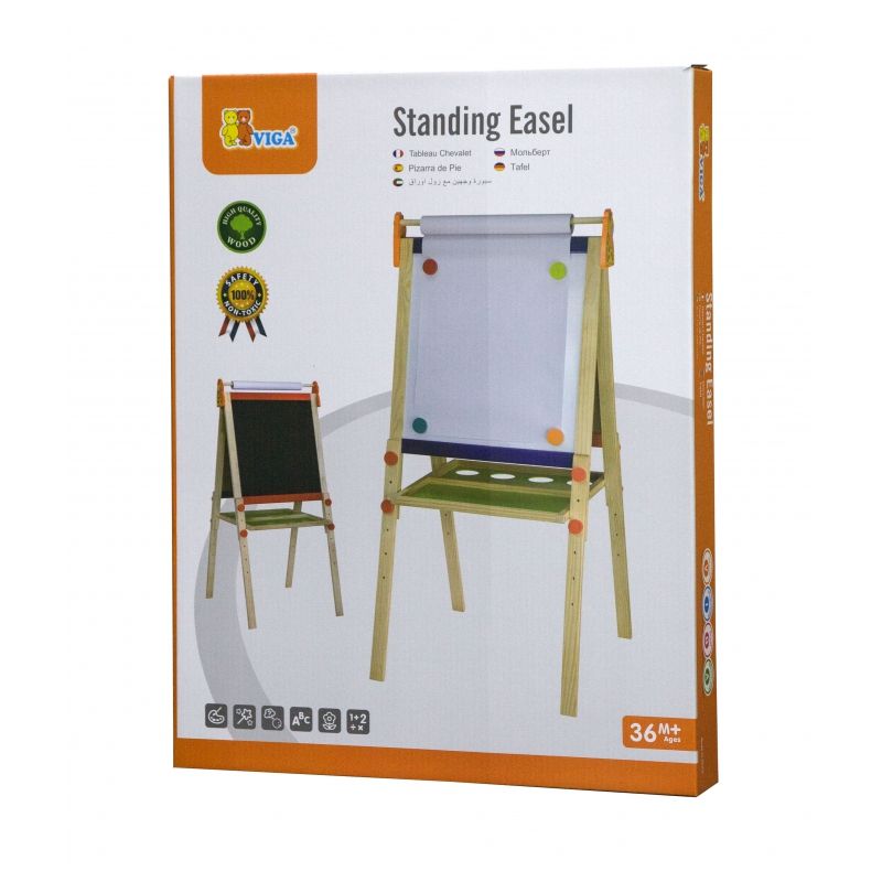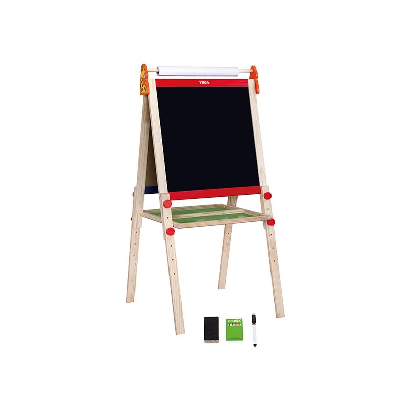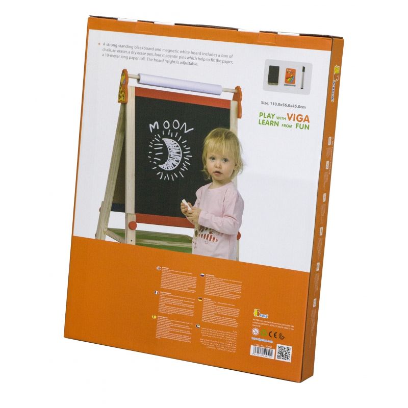 Zabawki firmy Viga Toys cechuje bardzo wysoka jakość wykonania. Są wykonane z najwyższą starannością z trwałych i bezpiecznych materiałów. Na jednej planszy można pisać kredą, a na drugiej mazakiem. W zestawie znajduje się tablica, zestaw kred, mazak, gąbka oraz 4 mazaki. Ponadczasowy charakter zabawy zapewni doskonałą rozrywkę maluchom!