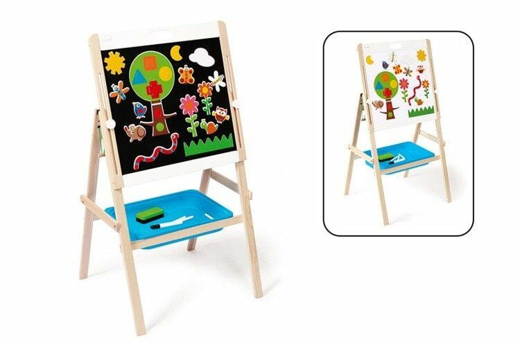 Dwustronna tablica magnetyczna daje dziecku wiele możliwości zabawy. Jedna strona to tradycyjna czarna tablica, po której można pisać kredą. Po drugiej stronie znajduje się suchościeralna biała tablica pozwalająca na pisanie po niej markerami. Obie strony są magnetyczne. Do tablicy dołączono różnokolorowe magnesy, trzy kawałki kredy, marker praz gąbkę do ścierania, a pod deską umieszczono pięciometrową rolkę papieru do rysowania. Szkrab ma do dyspozycji również niebieską półeczkę do przechowywania wszystkich akcesoriów. Wysokość tablicy można dostosować do wzrostu malca – od 87 do 120 cm.