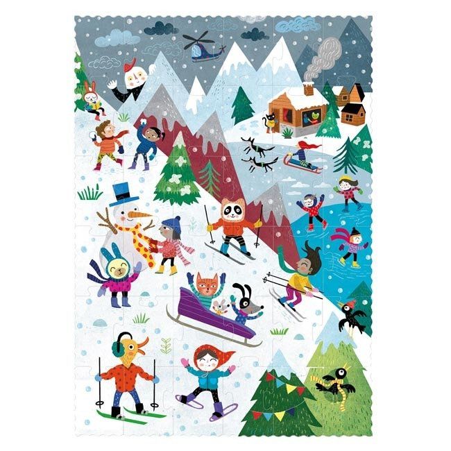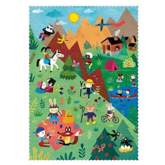Zestaw składa się z 36 elementów wykonanych z utwardzonego kartonu. Pierwsza strona puzzli przedstawia postaci wykonujące rozmaite czynności podczas letnich wakacji w górach, druga natomiast to kontynuacja ich przygód w okresie zimowym. Ilustracje z obu stron utrzymane są w pięknej, bajkowej stylistyce pobudzającej dziecięcą wyobraźnię!