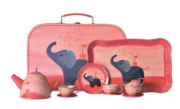 Metalowy zestaw herbaciany zawiera tacę, dzbanek oraz cztery filiżanki ze spodeczkami. Wszystko zapakowane jest w piękną walizkę z ilustracją słonika o wymiarach 29 x 20 x 10 cm.