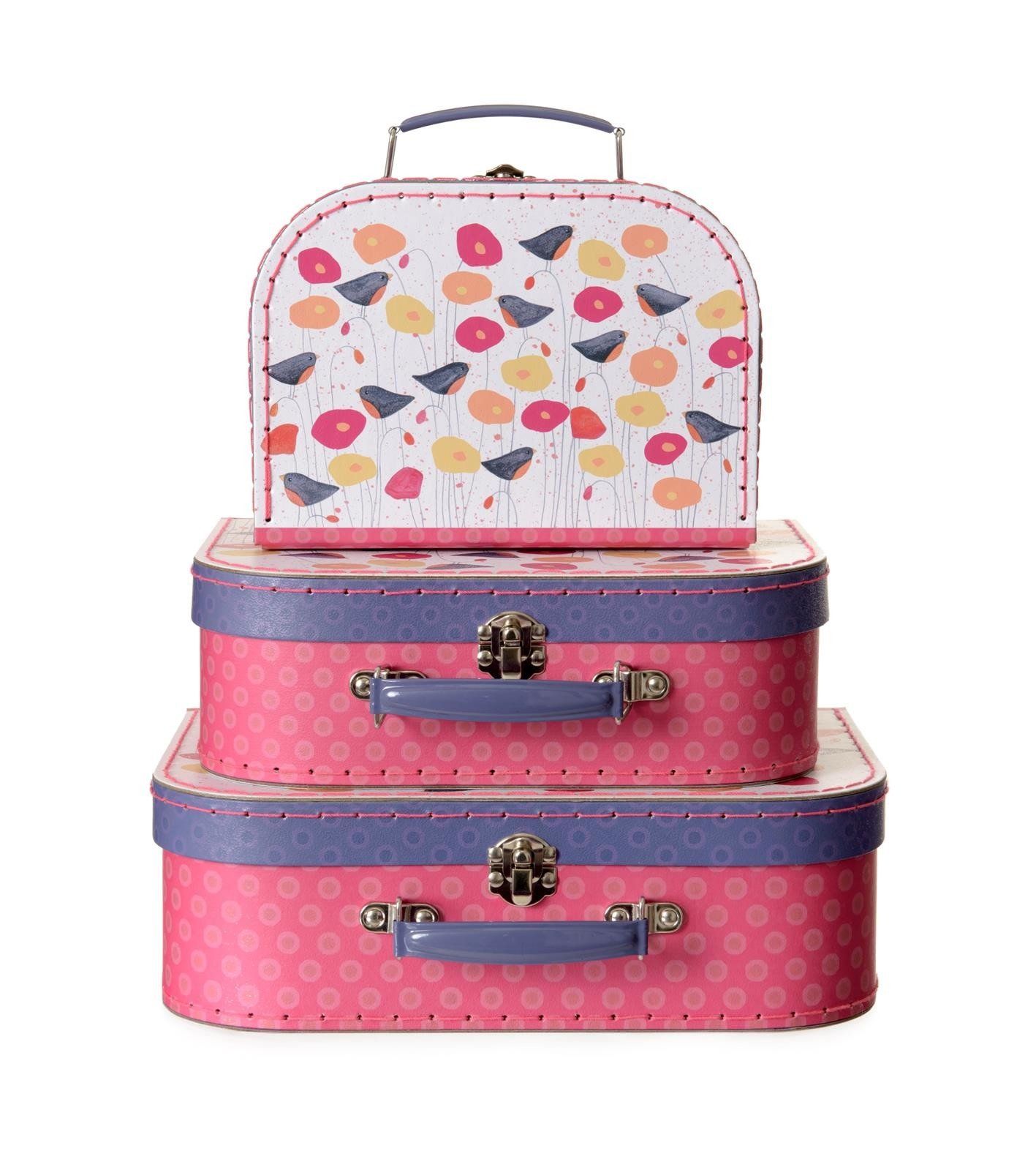 Zestaw składa się z trzech walizek o różnych wielkościach, utrzymanych w delikatnej różowo-fioletowej kolorystyce z ilustracjami ptaszków siedzących na makach. Walizki w stylu retro to doskonały sposób na przechowywanie lub przenoszenie ubranek i zabawek Twojego maluszka! Teraz wszystko będzie pod ręką!