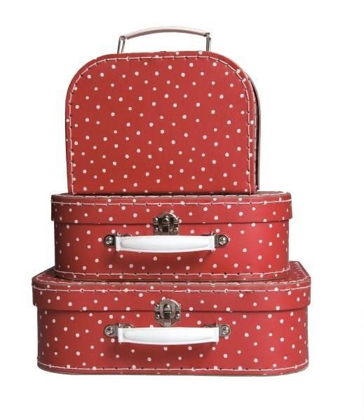 Zestaw składa się z trzech walizek o różnych wielkościach, utrzymanych w czerwonej kolorystyce z białymi groszkami. Walizki w stylu retro to doskonały sposób na przechowywanie lub przenoszenie ubranek i zabawek Twojego maluszka! Teraz wszystko będzie pod ręką!