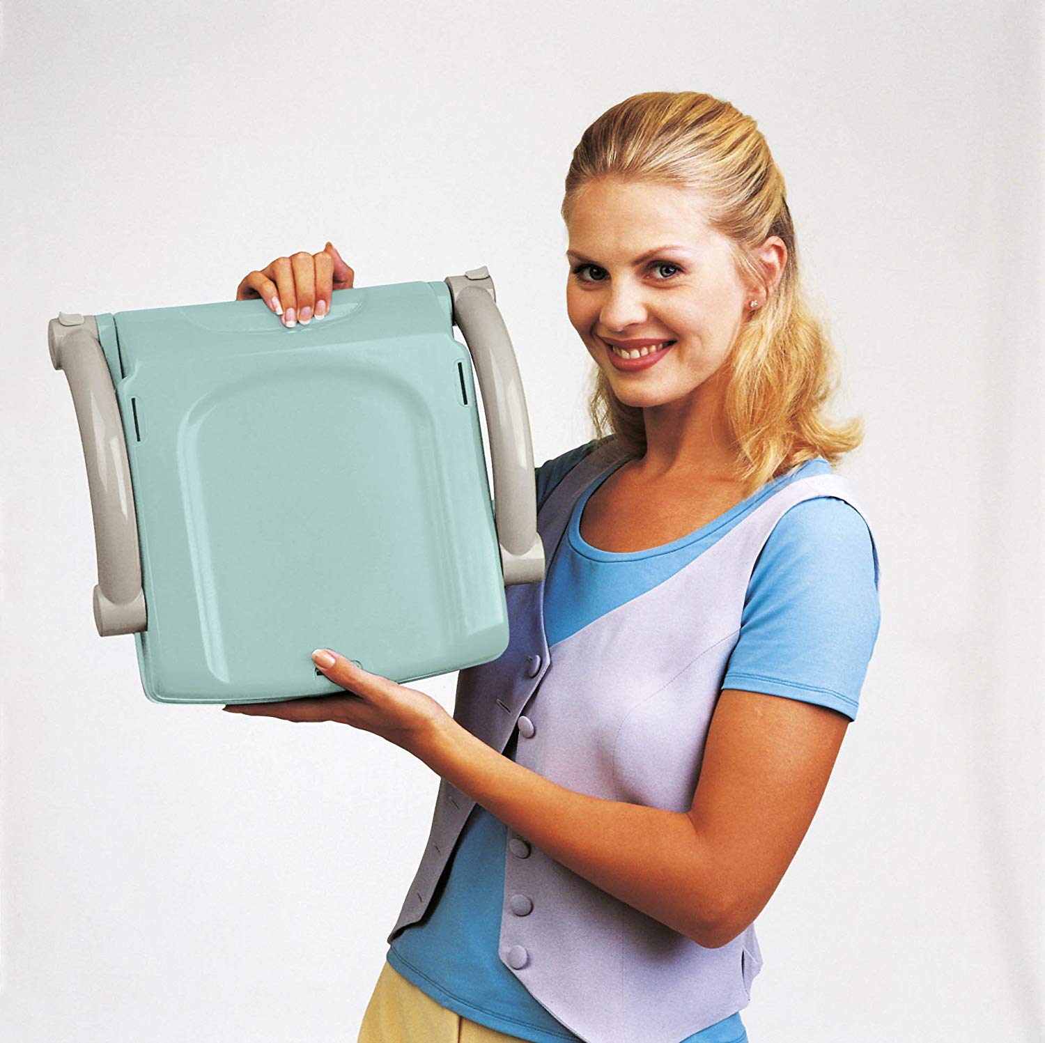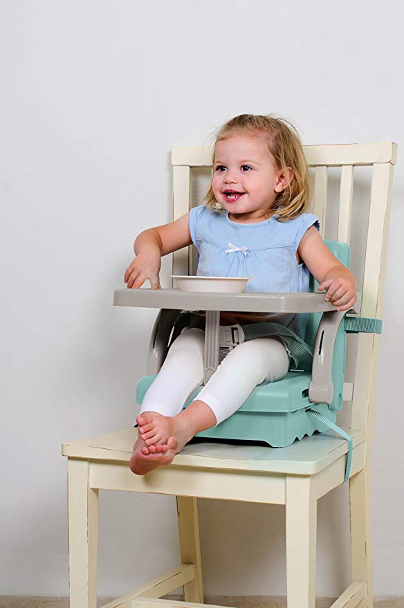 Fotelik ma pasy mocujące go do krzesła oraz zdejmowaną tackę. Posiada również pas bezpieczeństwa dla dziecka. Składa się w wygodną, kompaktową walizkę z rączką do przenoszenia, dzięki czemu będzie idealny zarówno w domu, jak i w podróży.