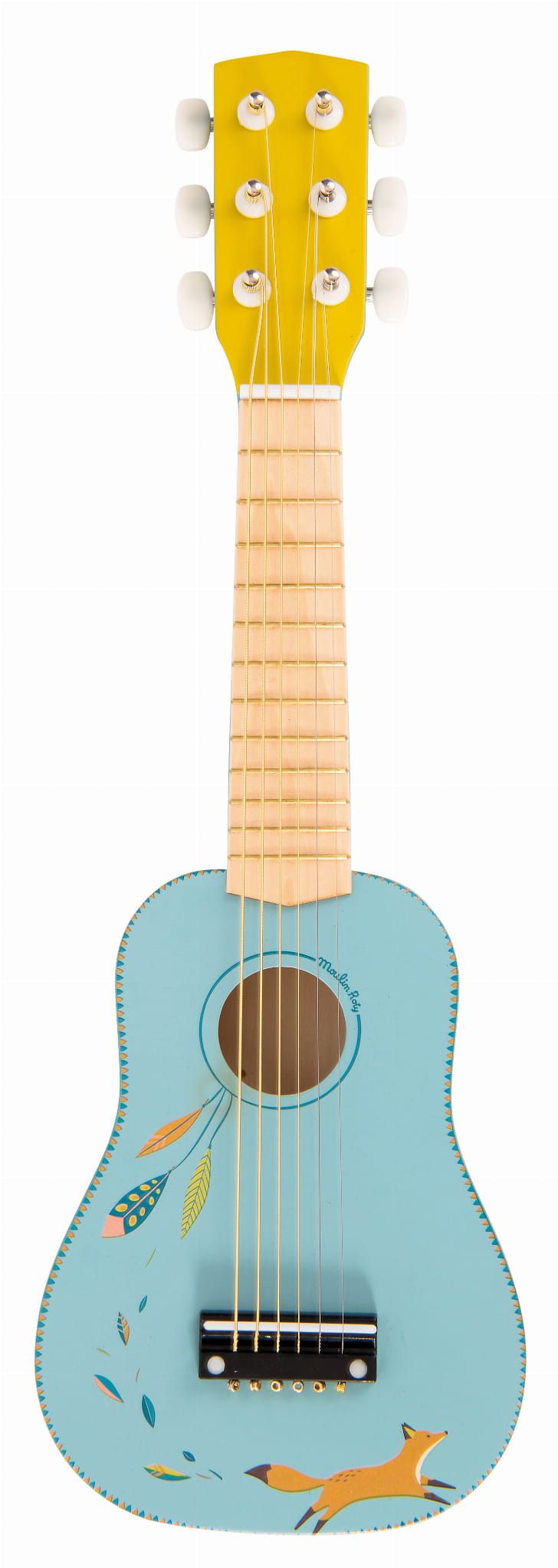 Ta 6-strunowa gitara pozwoli Twojemu dziecku zapoznać się z pierwszymi chwytami gitarowymi. Instrument muzyczny ma piękna dekorację lisa z kolekcji Podróże Olgi otoczonego piórami. Idealny do rozwijania umiejętności motorycznych Twojego malucha.
