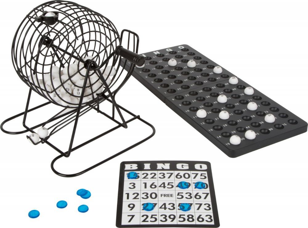 W zestawie znajduje się: metalowy bęben z kołowrotkiem do losowania, kulki z liczbami 1-75, 18 kart z numerkami, kolorowe żetony do obstawiania oraz planszę do odkładania wylosowanych kul.