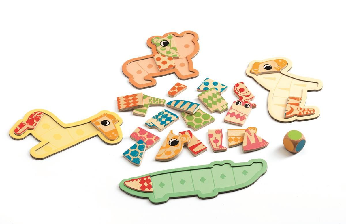 Drewniana gra Bingonimo świetnie sprawdzi się jako oryginalny prezent dla małego miłośnika układanek. Zestaw zawiera cztery plansze w kształcie dzikich zwierząt, kolorowe puzzle oraz kostkę z kolorami. Chcąc ułożyć wybrane zwierzątko, dziecko musi rzucić kostką i położyć na planszę element w wylosowanym kolorze. By osiągnąć cel, wystarczy parę rzutów i trochę główkowania!