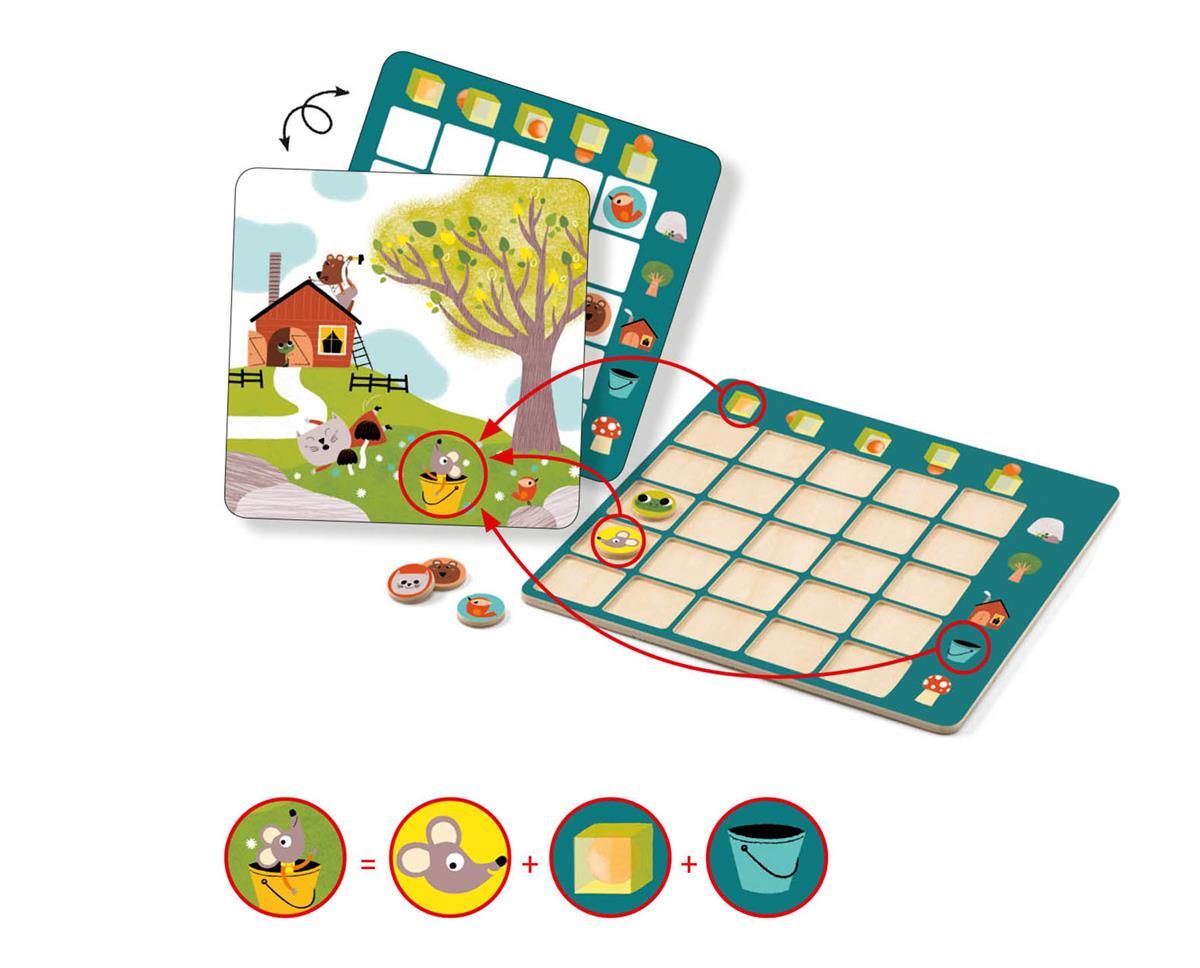 Eduludo Topologix to pomysłowa gra, która wzbudzi zainteresowanie każdego małego bystrzaka. Zestaw zawiera drewnianą planszę, 5 żetonów ze zwierzątkami oraz 20 kart z kolorowymi obrazkami. Zadaniem dziecka jest wybranie obrazka, odnalezienie na nim zwierzątek i właściwe rozmieszczenie żetonów na planszy.