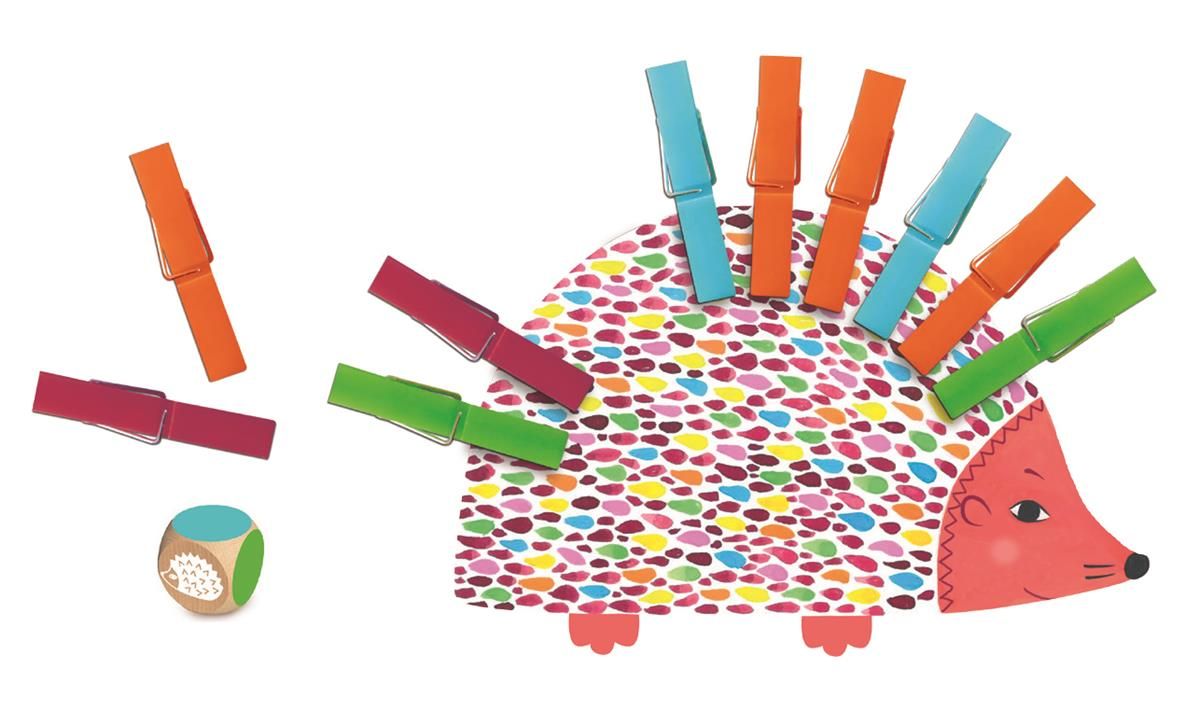 Prezent w postaci gry Jeżyk z klamerkami sprawi, że na twarzy dziecka pojawi się radosny uśmiech. Zestaw zawiera 2 plansze-jeże, 24 spinacze w 4 kolorach oraz kostkę do rzucania. Uczestnicy zabawy na zmianę rzucają kostką, a następnie wykonują odpowiednie czynności (zawieszają spinacze na ubraniu, przenoszą spinacze na swojego jeża, wkładają spinacze do pojemnika itp.). Zabawa na pewno spodoba się brzdącowi!