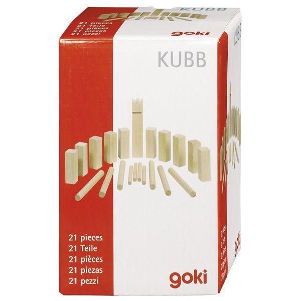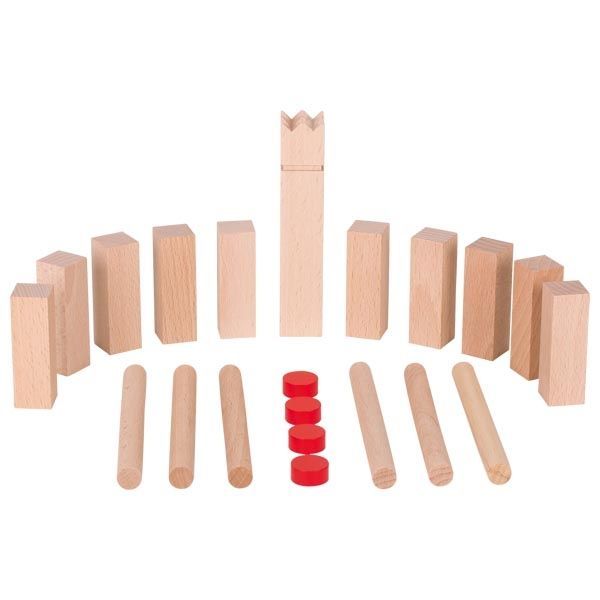 Zestaw zawiera: figurkę króla 2,5 x 2,5 x 12 cm, 10 drewnianych klocków (Kubbs) 2 x 2 x 6 cm, 6 okrągłych drewnianych patyków (1 x 12 cm), 4 czerwone kołki do zaznaczenia pola (1,8 x 0,8 cm).