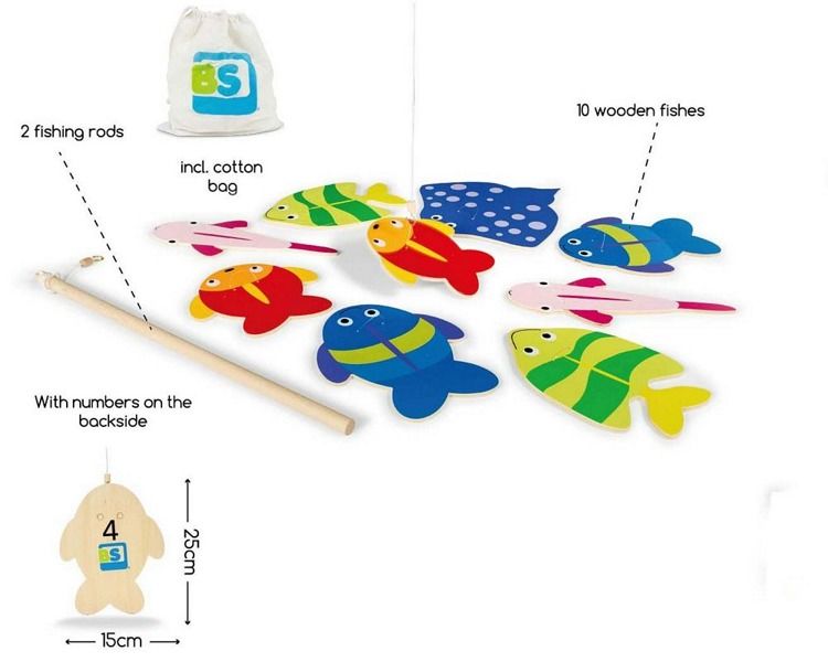 Zabawki holenderskiej firmy BS Toys cechuje bardzo wysoka jakość wykonania. Gra wytworzona jest z trwałego materiału, a jej pięknie wykonane, różnokolorowe ilustracje zachęcą do zabawy. Zestaw zawiera 10 rybek oraz 2 wędki. Ponadto dołączono został praktyczny, bawełniany woreczek do przechowywania zabawki.