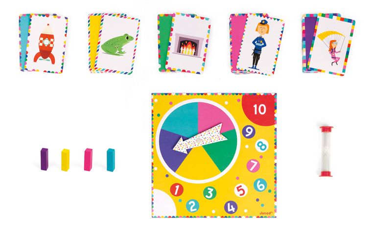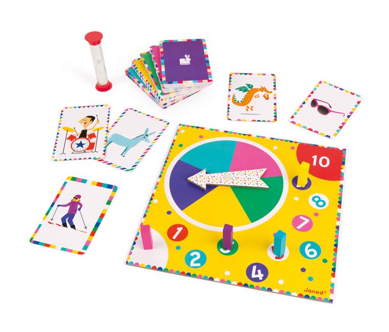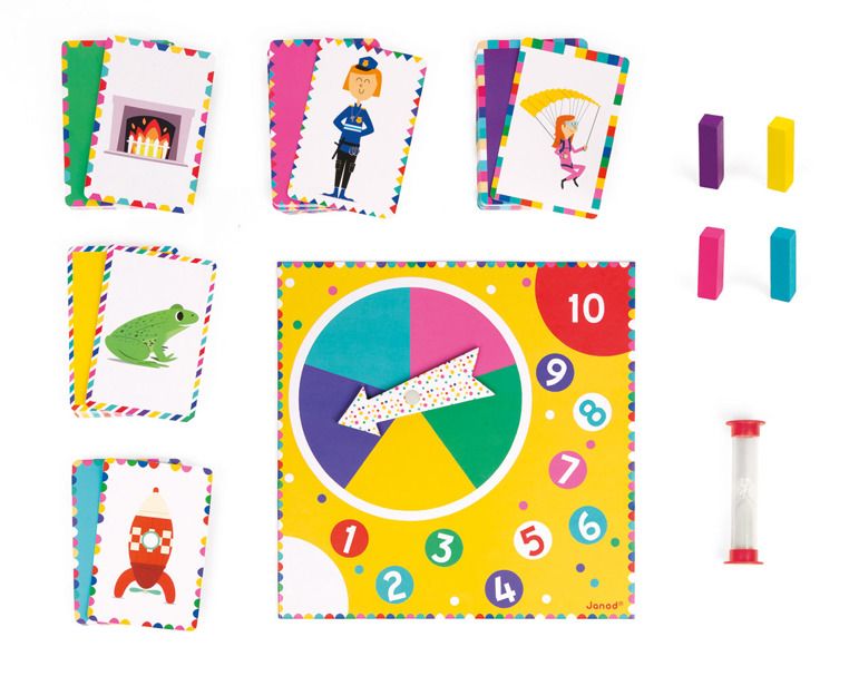 - liczba elementów: 120 kart, plansza, 4 pionki, klepsydra