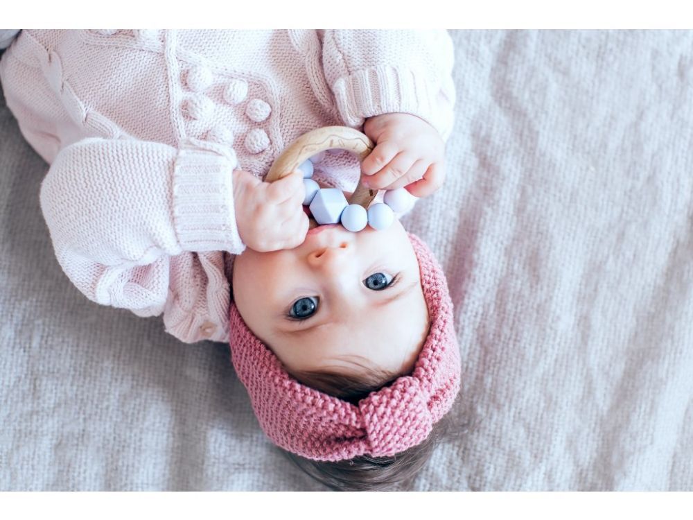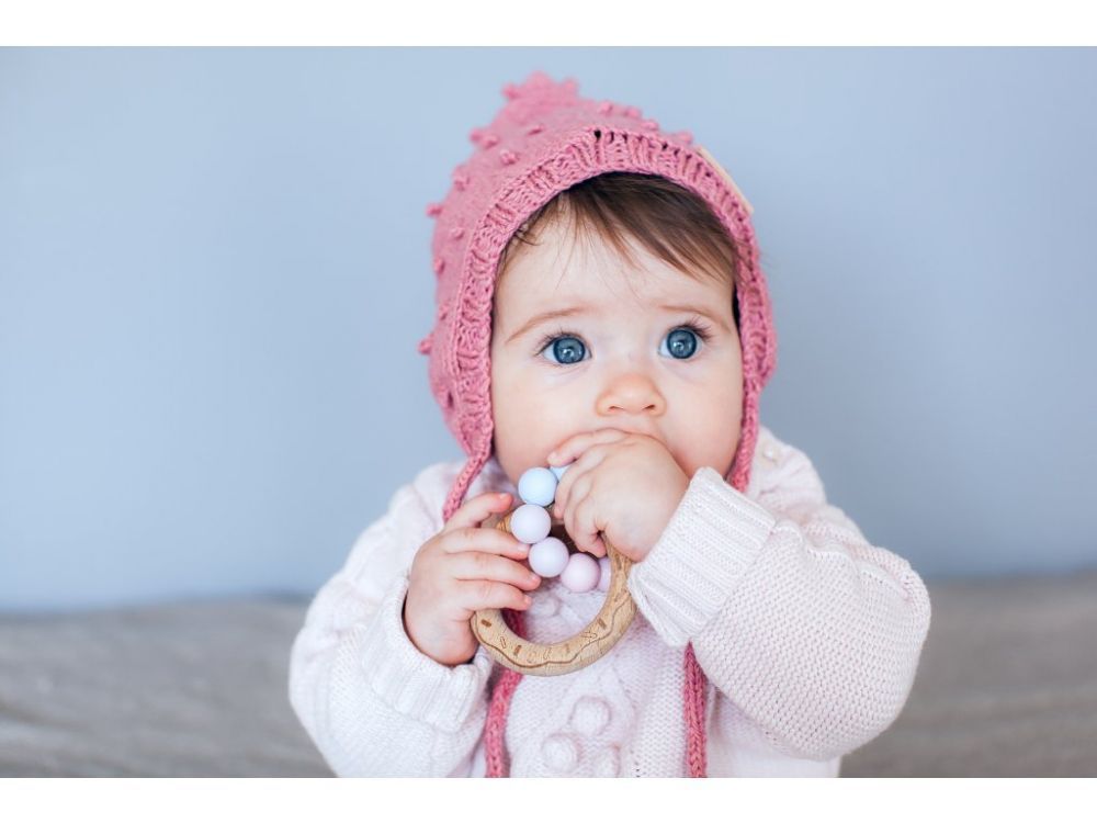 Obręcz z koralikami jest połączona z drewnianym kółeczkiem, dzięki któremu maluszek może łatwo chwycić gryzak.