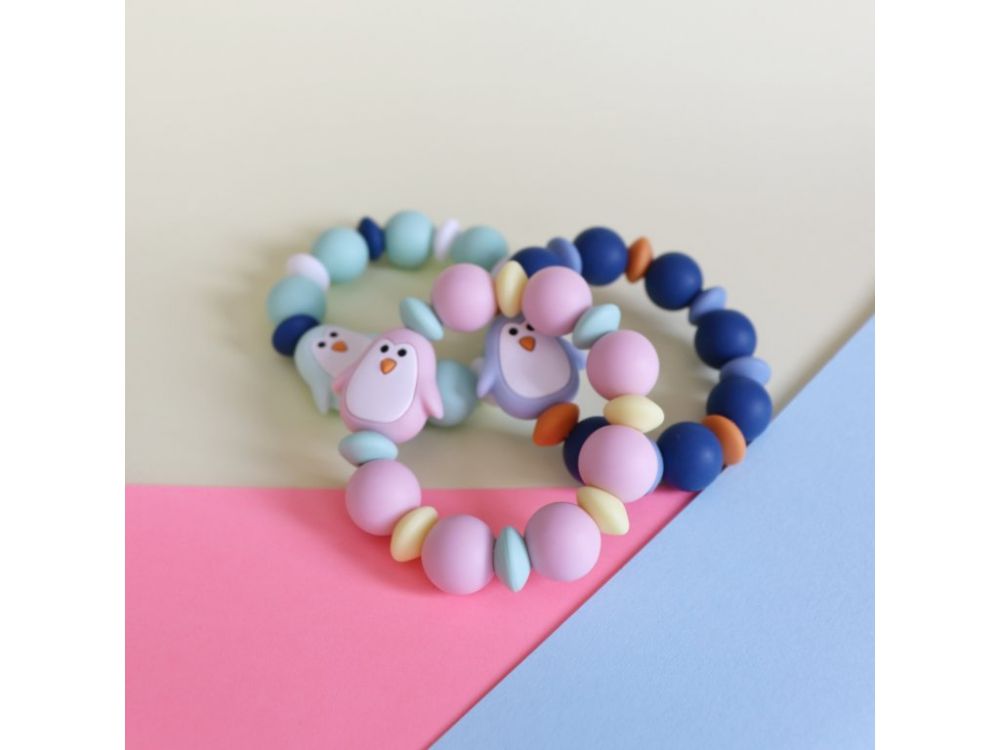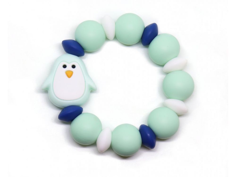 Gryzak ma formę obręczy, na której umieszczono silikonowe koraliki i uroczego pingwinka. Taka forma sprawia, że niemowlakowi będzie łatwo chwycić przedmiot.