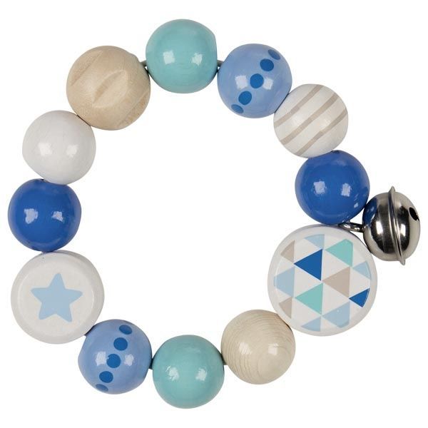 Grzechotka pierścień elastyczny niebieska gwiazdka Heimess ucieszy każdego niemowlaka. Grzechotka doskonale sprawdzi się wśród dzieci wrażliwych na bodźce – dźwięk, który wydaje jest delikatny i dość cichy. Obręcz wykonano z elastycznego sznureczka. Najbardziej atrakcyjnymi elementami są: ozdabiane koraliki, koralik z wgłębieniami – dziecko może odróżnić go od innych za pomocą zmysłu dotyku. I oczywiście dzwoneczek.