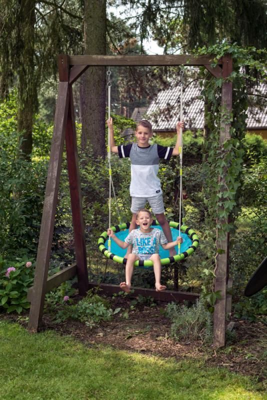 Huśtawka Bocianie gniazdo to doskonały sposób na wesołą zabawę na świeżym powietrzu. Można ją zamontować np. na działce lub w ogrodzie, gdzie maluszek będzie mógł bawić się w otoczeniu przyrody. Całość wyposażono także w wygodne siedzisko, dzięki czemu rozrywka jest przyjemna i komfortowa. Maksymalny udźwig produktu to 80 kg.