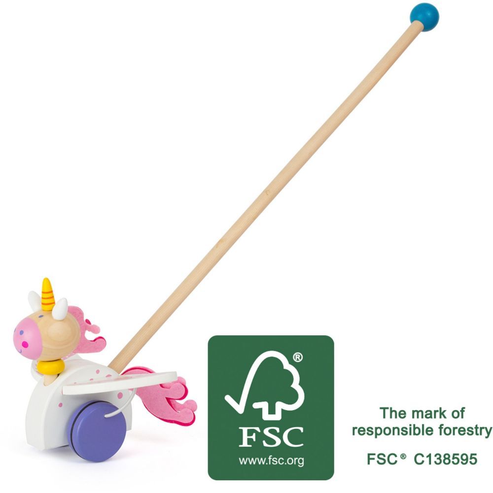 Jednorożec na kiju do pchania Luna Sfd to zabawka, która będzie stanowiła dla dziecka zachętę do doskonalenia techniki chodzenia. Do bajkowego jednorożca przymocowano kijek, za który maluch może go pchać. Zabawka ma kółka, dzięki czemu płynnie się przemieszcza. Jednorożec posiada skrzydła, które będą się poruszały podczas spacerków. To z pewnością da dziecku jeszcze więcej radości.