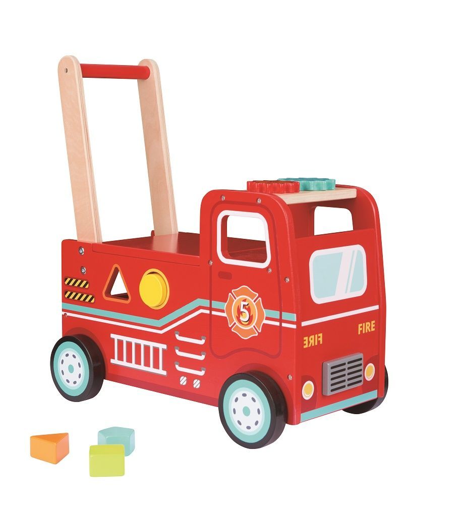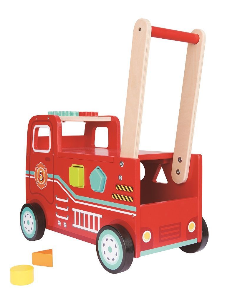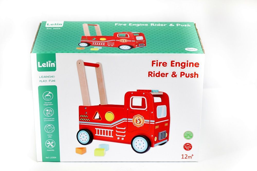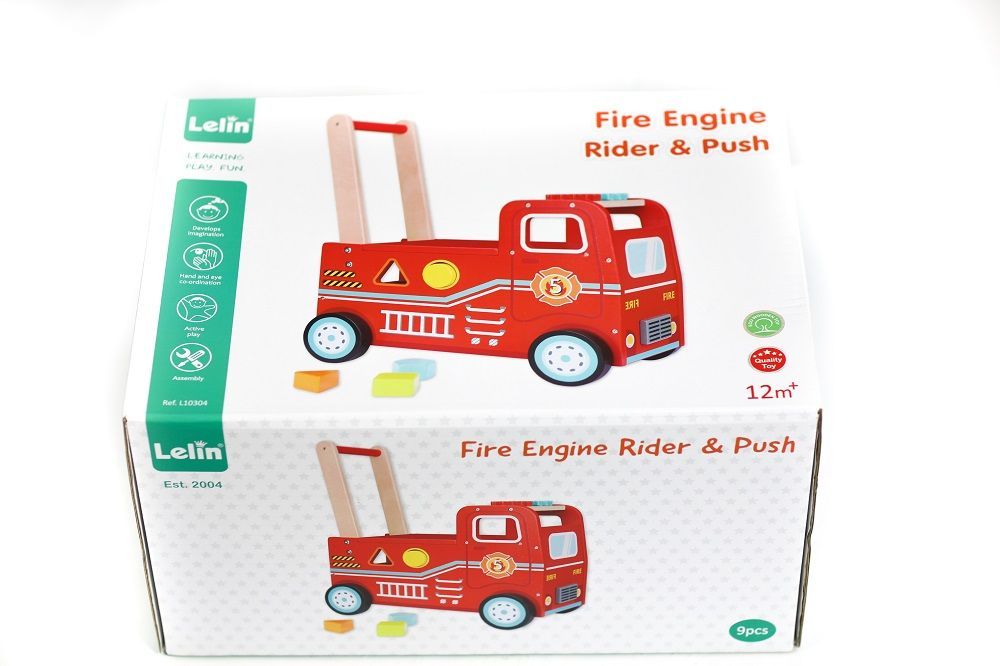 Jeździk pchacz wóz strażacki Lelin to wielofunkcyjny produkt, który łączy w sobie kilka zabawek. Wóz może służyć jako pchacz – dziecko może trzymać go za uchwyt i doskonalić technikę chodzenia, jako jeździk – maluch może usiąść na wozie i odpychać się nóżkami, jako pojemnik na zabawki oraz jako sorter. Z boku wozu znajdują się otwory w kształcie podstawowych kształtów geometrycznych. Do zestawu dołączono odpowiadające im klocki. W zestawie znajdziemy też uchwyty, które należy przymocować do wozu oraz prostą instrukcję. Siedzisko znajdujące się na dachu można podnieść, abyb wyjąć klocki lub aby przechowywać tam zabawki.