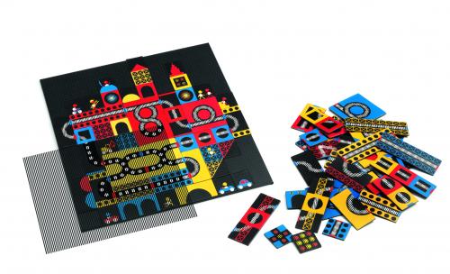 Kinoptik Miasto zapewni smykowi niezwykłe doznania wzrokowe. Zestaw zawiera planszę magnetyczną, 123 elementy do układania, dwie przezroczyste nakładki oraz obrazkową instrukcję z przykładowymi wzorami. Zadanie dziecka polega na ułożeniu elementów na planszy w taki sposób, by powstał obrazek przedstawiający miasto, a następnie przyłożeniu specjalnej folii, która pozwala stworzyć iluzję ruchu.