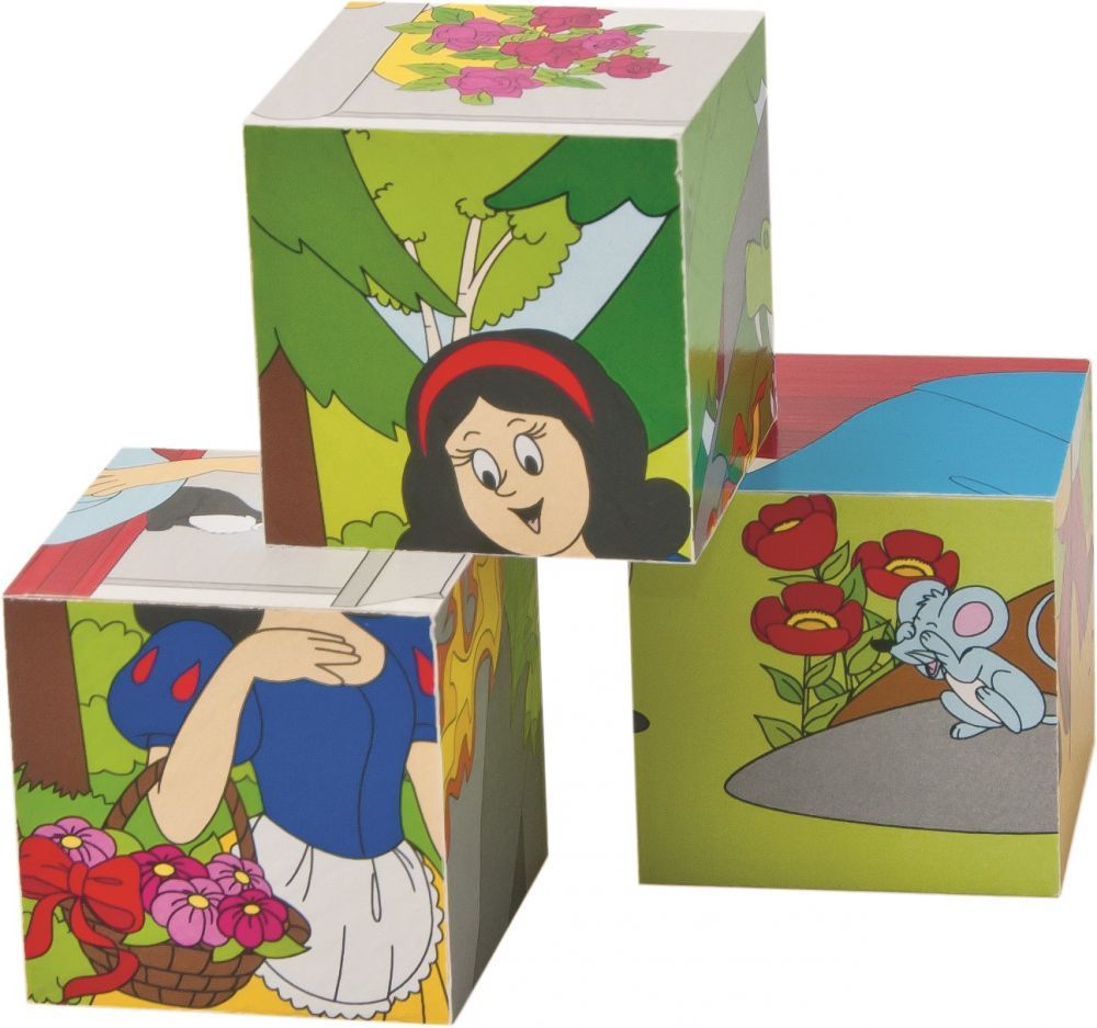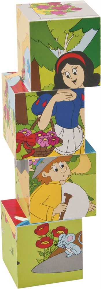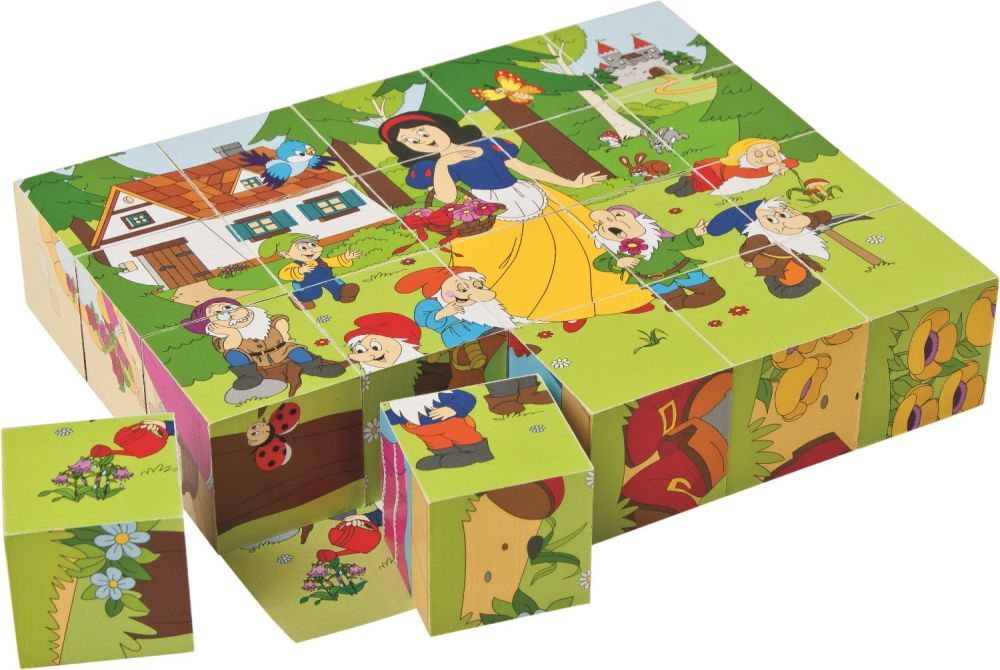 Zestaw zawiera 20 sześciennych kostek. Zadaniem dziecka jest wybranie odpowiedniej strony i dopasowanie tak, żeby utworzyć obrazek. Do klocków dołączone są grafiki pomocnicze. Na obrazkach znajdują się popularne bajki, takie jak Królewna Śnieżka, Kot w butach czy Kopciuszek.