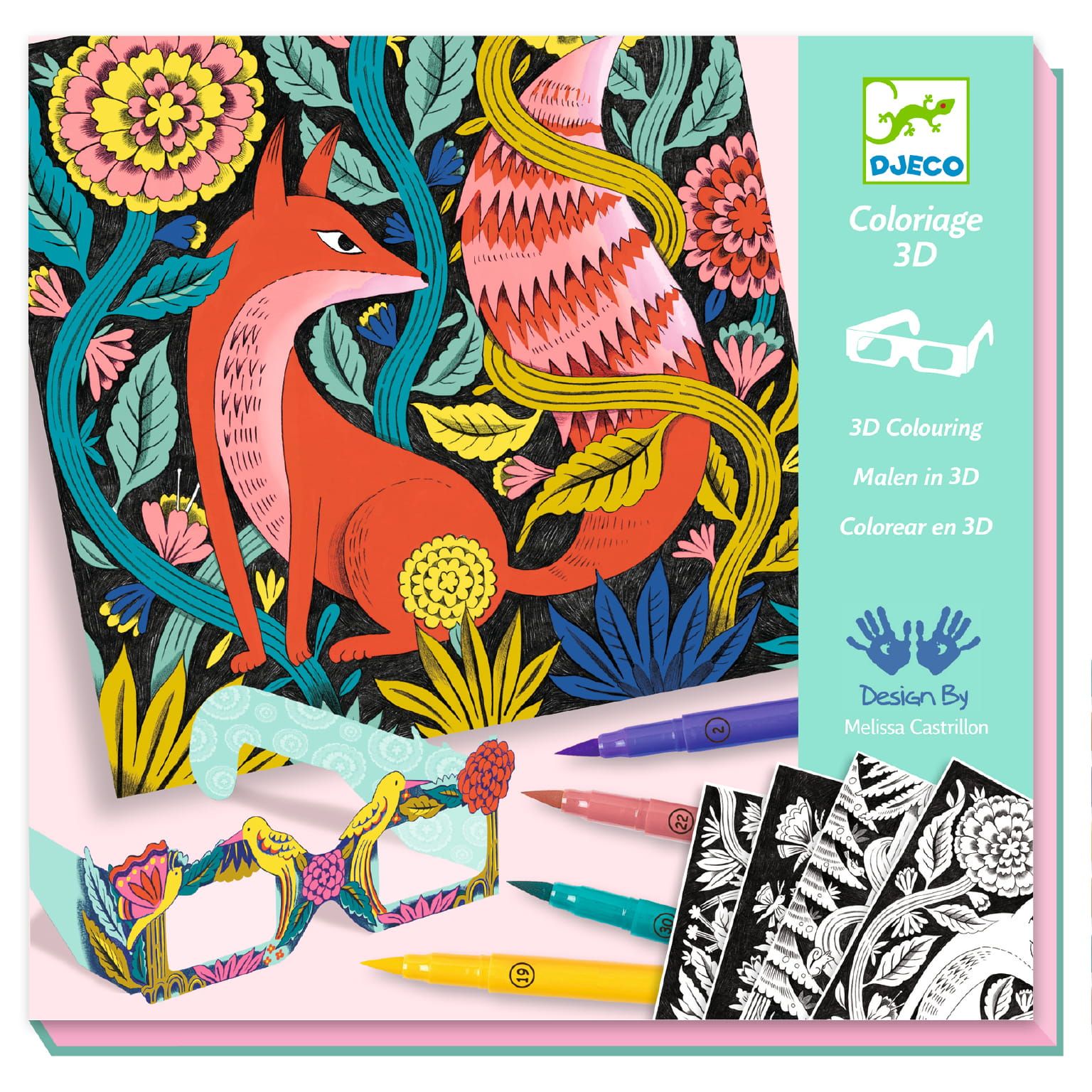 Atrakcyjna kolorowanka Zaczarowany las zachwyci dziecko zarówno pięknymi obrazkami, jak i trójwymiarowym efektem. Zestaw zawiera 4 karty z ilustracjami do pokolorowania, 7 dwustronnych flamastrów, okulary 3D oraz instrukcję obrazkową krok po kroku. Flamastry mają dwie końcówki – jedną cienką i twardą do rysowania kresek, drugą miękką, pędzelkową, służącą do zamalowywania większych powierzchni.