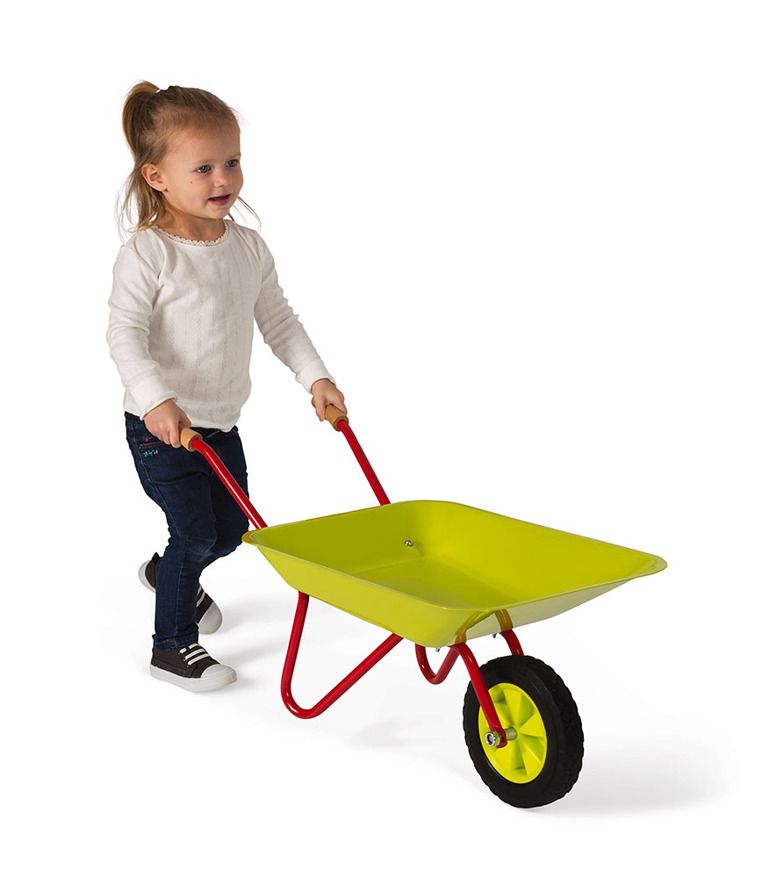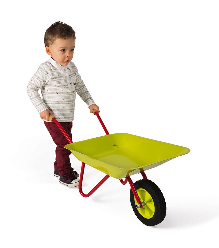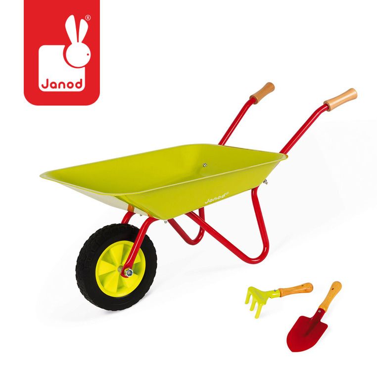 Jeśli Twoje dziecko lubi bawić się w ogrodzie, to zestaw akcesoriów ogrodniczych francuskiej marki Janod został stworzony specjalnie dla niego. Narzędzia wyglądają jak ich dorosłe odpowiedniki, dzięki czemu Twoje dziecko poczuje się jak prawdziwy ogrodnik. Komplet składa się z jasnozielonej taczki zrobionej z metalu, posiadającej drewniane rączki i gumowe koło oraz dwóch narzędzi – czerwonej łopatki i zielonych grabek, które mają drewniane uchwyty. Taczka jest stabilna, dzięki szeroko rozstawionym metalowym podpórkom, a rączki zostały ustawione na odpowiedniej dla dziecka wysokości, aby ułatwić mu prowadzenie.