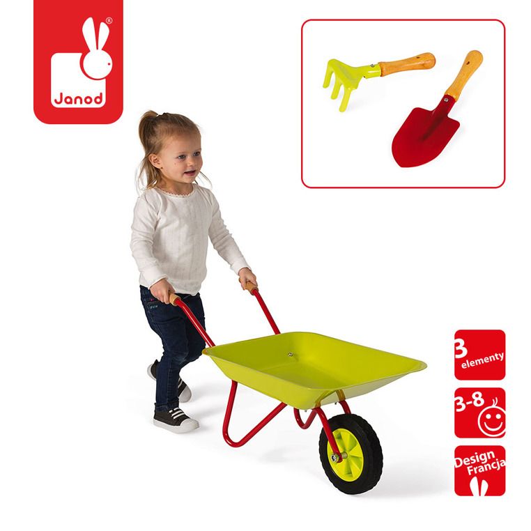 Taczka oraz komplet dwóch narzędzi wykonane są z bezpiecznych i trwałych materiałów. Francuska marka Janod od zawsze dba, aby ich produkty miały najwyższą jakość i przynosiły dzieciom wiele radości z zabawy. Zestaw sprzedawany jest w ślicznym opakowaniu, dzięki czemu idealnie nada się na sprezentowanie go dziecku.