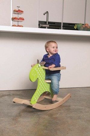 Ozdobiony białymi groszkami konik w pięknym zielonym kolorze z pewnością oczaruje maluszka – spodobają mu się zwłaszcza miękkie uszka oraz przyjemna w dotyku bawełniana grzywa. Jazda na koniku na biegunach rozwija koordynację ruchową i działa na dziecko uspokajająco. Samodzielne kołysanie się stanowi również świetny trening równowagi dla malca.