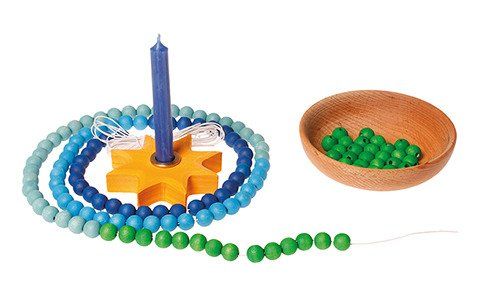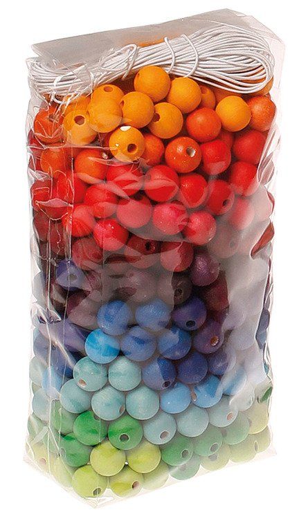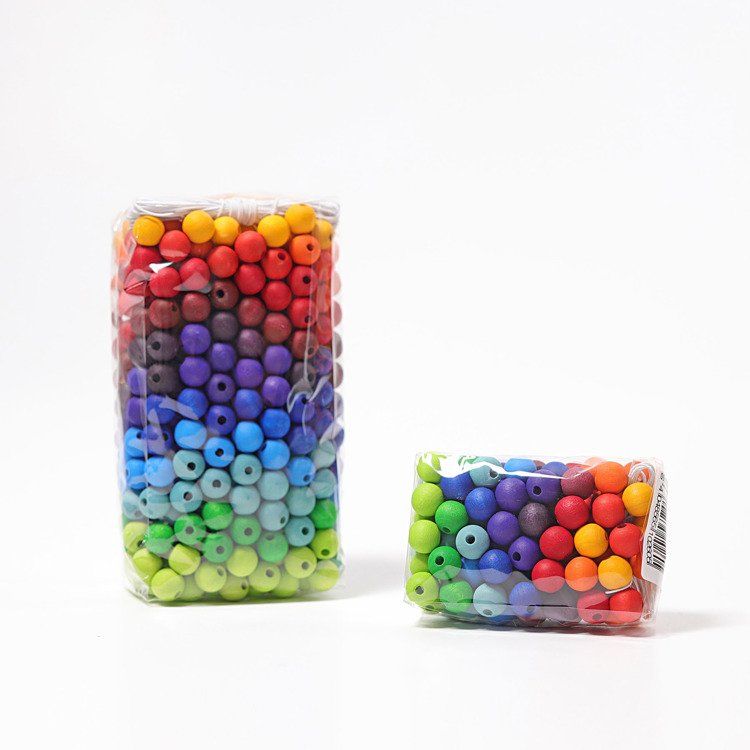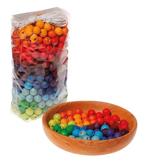 Tęczowe koraliki zostały wykonane z drewna klonowego, wykończonego nietoksycznymi bejcami na bazie wody. Koraliki można nawlekać na sznurek, tworząc kolorowe liczydło. Elementy można także wykorzystać do zrobienia ślicznych dekoracji, zdobiących dziecięcy pokój, czy też użyć je przy budowaniu konstrukcji z innych zestawów Grimm’s.
