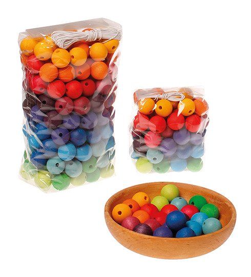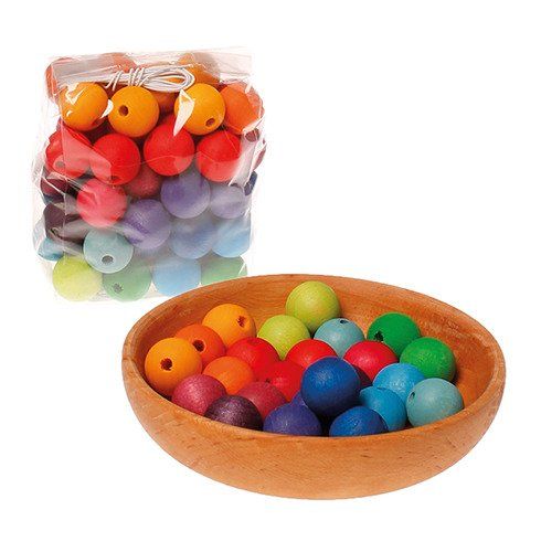 Tęczowe koraliki zostały wykonane z drewna klonowego, wykończonego nietoksycznymi bejcami na bazie wody. Koraliki można nawlekać na sznurek, tworząc kolorowe liczydło. Elementy można także wykorzystać do zrobienia ślicznych dekoracji, zdobiących dziecięcy pokój, czy też użyć je przy budowaniu konstrukcji z innych zestawów Grimm’s.
