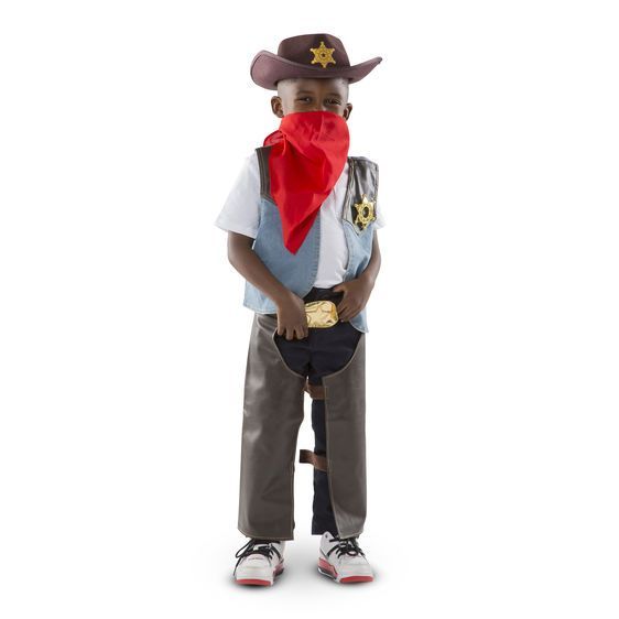 Kostium Kowboya Melissa & Doug zachwyci każdego pasjonata dzikiego zachodu! Zestaw zawiera strój kowboya, który wykonano z dbałością o każdy szczegół! W jego skład wchodzą: kowboyski kapelusz z gwiazdą szeryfa, kamizelka z niebieskiego materiału typu jeans z brązowymi wstawkami na ramionach oraz gwiazdą szeryfa, ochraniacze na nogi z tkaniny imitującej skórę, czerwona bandana.