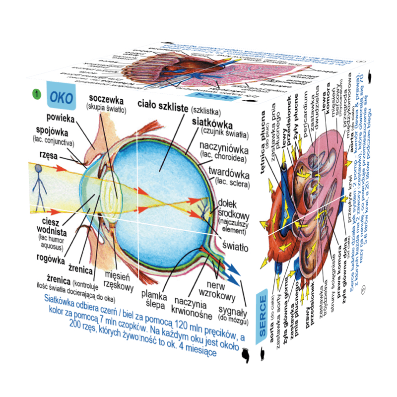 Zabawa z kostką to doskonały sposób, by pomóc dziecku w nauce anatomii. Całość zilustrowana jest przejrzystymi obrazkami, więc maluch będzie mógł dokładnie zobaczyć z czego składają się dane narządy. Kostkę można też składać i obracać, więc w tej prostej formie zawarto naprawdę dużo wartościowej wiedzy.