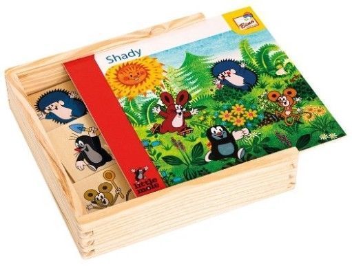 Zestaw zawiera 4 drewniane tabliczki z dziewięcioma cieniami postaci na każdej z nich oraz 36 klocków przedstawiających kolorowe postacie. Zadaniem dziecka jest dopasowanie kolorowych postaci do ich cieni. Całość spakowano do poręcznej, drewniane skrzyneczki. Układanka ta doskonale sprawdzi się zarówno w domu, jak i w przedszkolu bądź żłobku.